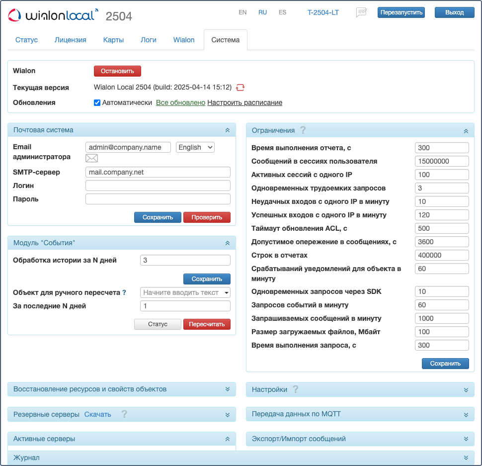 На этой вкладке можно вручную запустить/остановить Wialon Local, установить обновления, настроить сервер сообщений и установить важные ограничения.