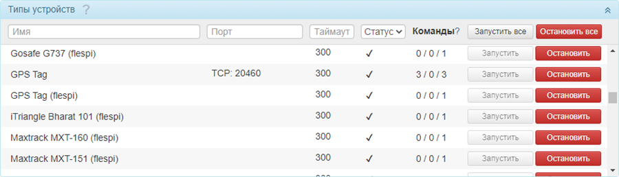 | Команды | В этом столбце показывается количество команд, доступных для устройств этого типа и передаваемых по каналам TCP, UDP и Virtual. Во всплывающей подсказке содержится подробная информация с именами всех команд для каждого канала. |