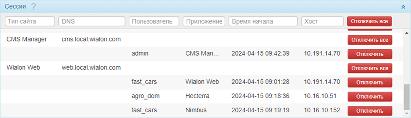 Кнопки Отключить и Отключить все останавливают выбранную сессию или все сессии соответственно.