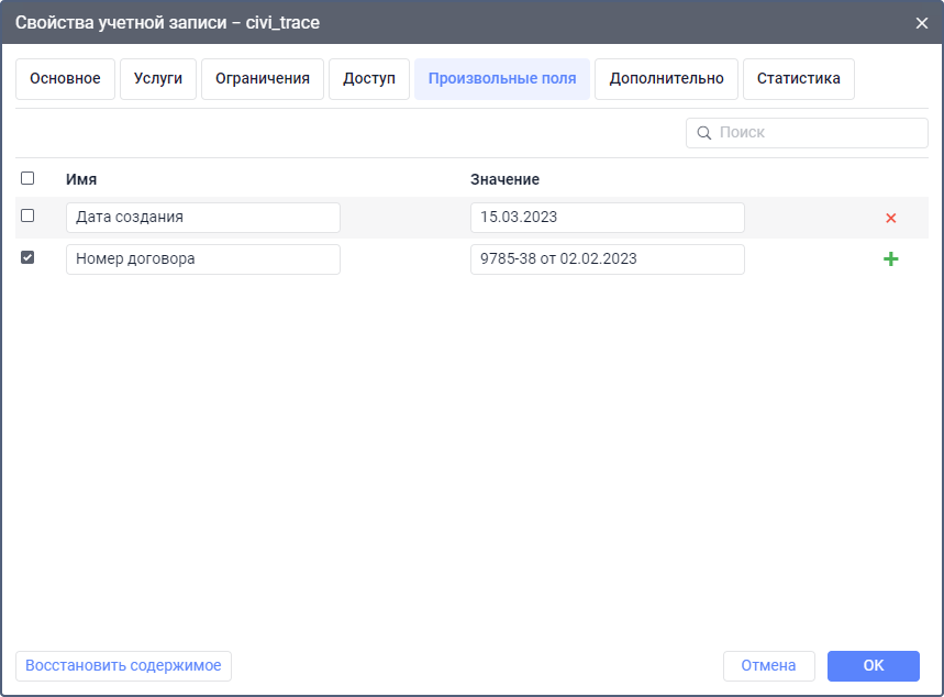 На этой вкладке можно создать произвольные поля с дополнительной информацией об учетной записи.