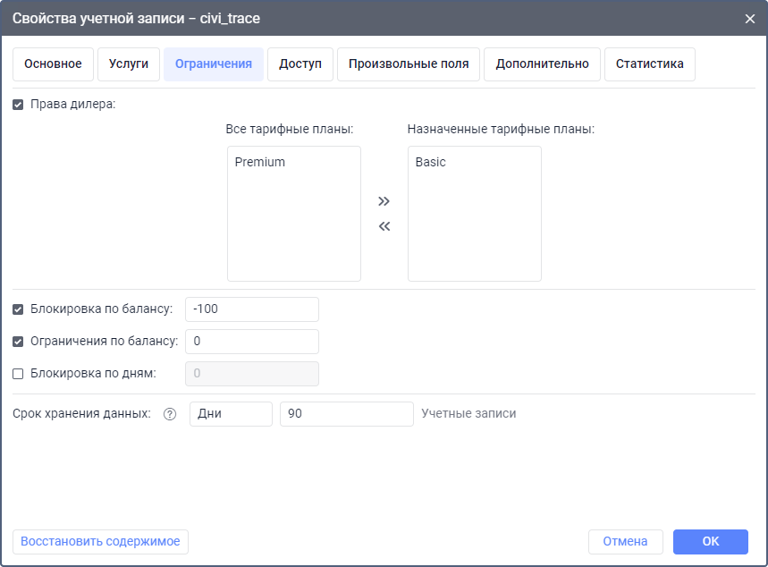 По умолчанию срок хранения данных берется из настроек тарифного плана. Если срок хранения данных, указанный для учетной записи, превышает период, указанный для тарифного плана, назначенного на эту учетную запись, то применяется срок из настроек тарифного плана. Если срок хранения данных в свойствах учетной записи меньше, чем тот, который указан для тарифного плана, то применяется срок из настроек учетной записи. Чтобы вернуть значение по умолчанию, укажите 0.