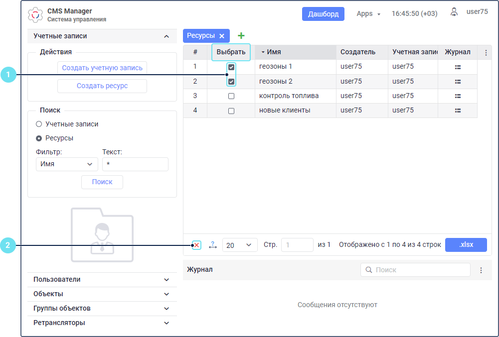 - Отметьте ресурс в таблице (столбец Выбрать).