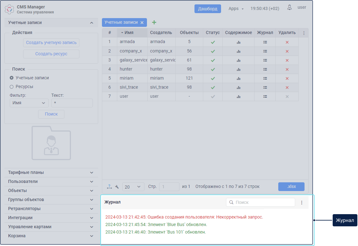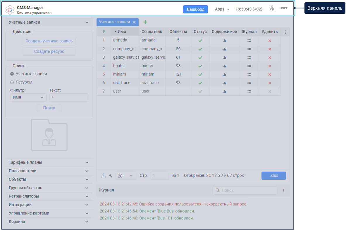 В интерфейсе системы управления можно выделить следующие основные элементы: