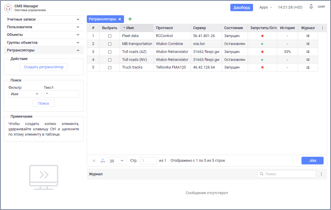 Ретрансляторы позволяют передавать сообщения от объектов с вашего сервера на другие серверы или системы в режиме реального времени или за прошедший период. С помощью ретрансляторов можно передавать данные одновременно на несколько серверов по разным протоколам.