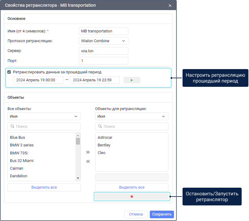для запуска и остановки ретрансляции и опция Ретранслировать данные за прошедший период.