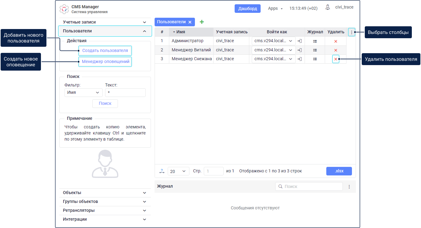 | Удалить | Иконка , которая позволяет удалить пользователя из системы. Если нет права доступа на удаление, вместо иконки показывается прочерк. Смотрите подробнее об особенностях удаления пользователей здесь. |