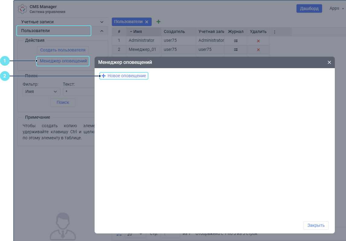 В разделе Пользователи нажмите на кнопку Менеджер оповещений.