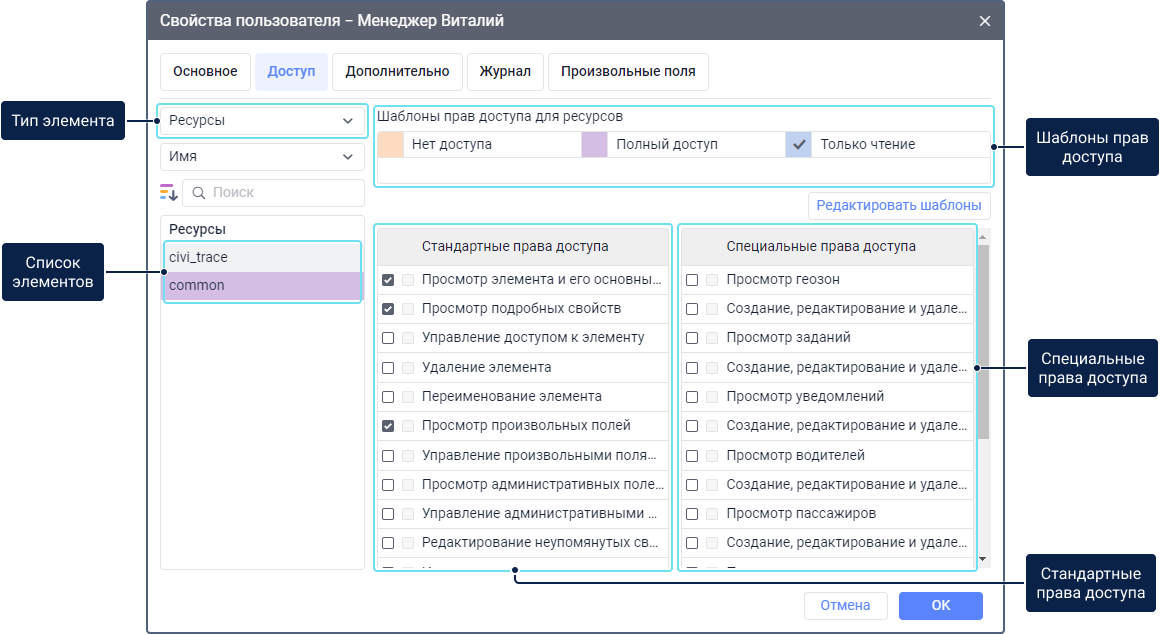 В правой части окна показываются права доступа на элементы, которые можно предоставить пользователю. Права разделены на два типа: стандартные и специальные, которые зависят от выбранного типа элементов (например, права доступа на объект).