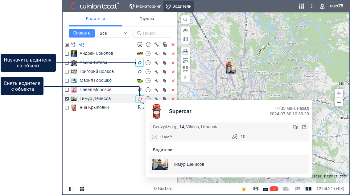Назначить и снять водителя с объекта можно вручную или автоматически. После этого можно работать с историей назначений.