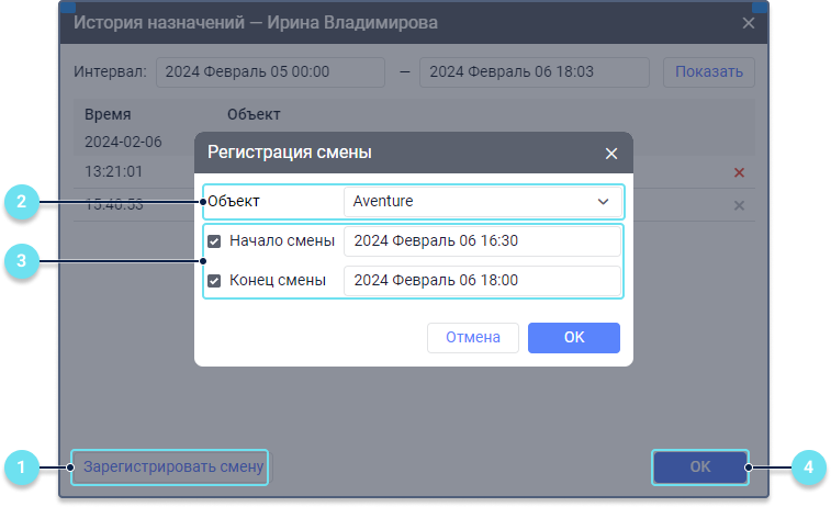Функция История назначений позволяет увидеть историю назначений водителя, вручную добавить записи о назначениях (зарегистрировать рабочую смену) и удалить их при необходимости. Чтобы выполнить эти действия, нажмите на иконку