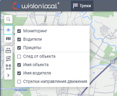 Графические слои вкладок можно включать только при наличии в главном меню вкладок с таким же названием. Например, если в главном меню есть пункт Мониторинг, на карте может быть показан графический слой с положением выбранных объектов. При добавлении пункта в главное меню его слой автоматически появляется на карте, при удалении пункта — слой исчезает.