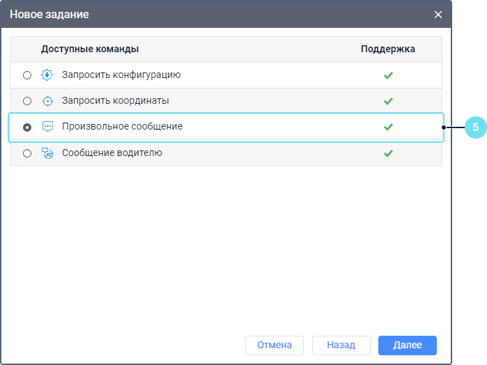 Установите параметры, которые зависят от выбранного типа задания и описаны в разделе Типы заданий. Для типа Отправить команду на объекты этот шаг выполняется после выбора объектов.