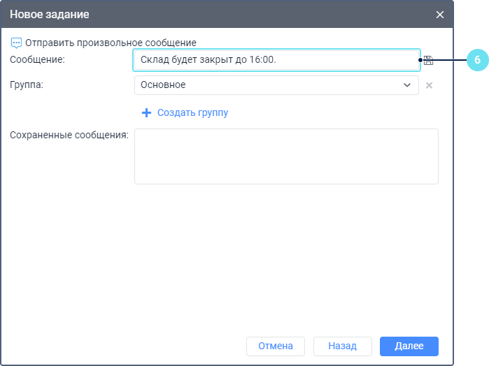 Имя* | Имя задания. Показывается в списке заданий и в качестве темы письма, если задание связано с отправкой информации по электронной почте. |