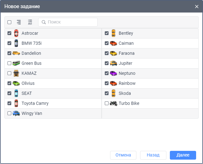 Чтобы выбрать объекты или группы, для которых необходимо создать задание, отметьте их в списке. Чтобы выбрать все элементы сразу, отметьте любой из них, удерживая клавишу Ctrl, или поставьте галочку в шапке таблицы.