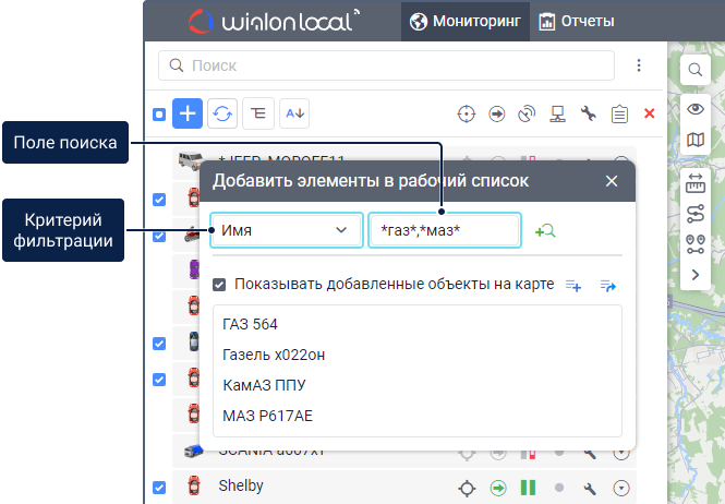 Для мониторинга объектов их необходимо поместить в рабочий список. Только объекты из рабочего списка могут показываться на карте и использоваться в различных задачах мониторинга: генерирование отчетов, назначение водителей и прицепов, просмотр сообщений, треков, поиск ближайших объектов и т. п.