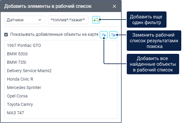 - на втором уровне рядом с фильтром в поле поиска вы указываете одно или несколько ключевых слов (их масок) через запятую. Например, чтобы найти все объекты с датчиками зажигания и/или топливными датчиками, после выбора фильтра Датчики вы можете ввести *зажиг*,*топлив*;