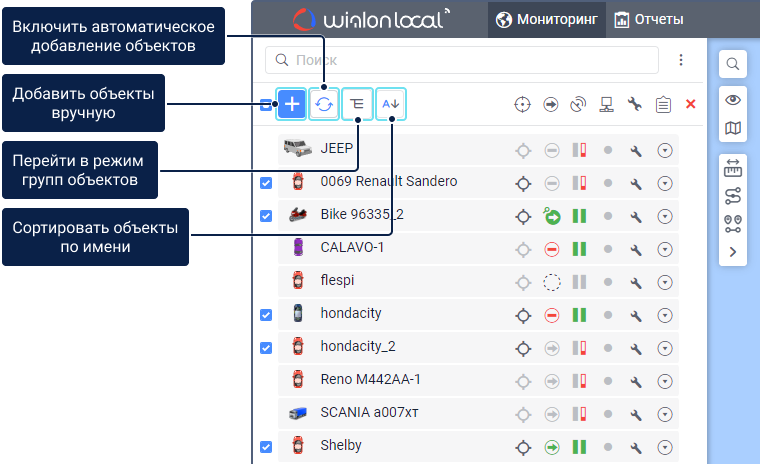 Добавлять объекты в список можно вручную или автоматически, используя следующие кнопки: