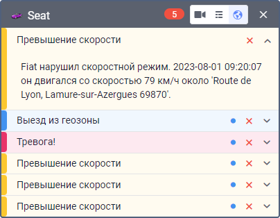 При срабатывании онлайн-уведомления мини-окно объекта открывается автоматически, если оно было закрыто. В его заголовке рядом с иконками режимов работы появляется индикатор непрочитанных уведомлений. Нажмите на него, чтобы посмотреть полученные уведомления.