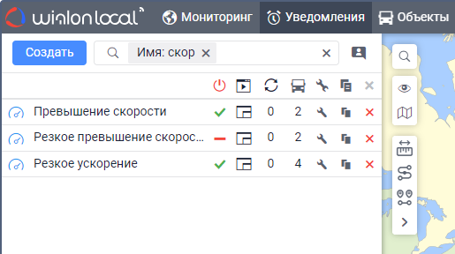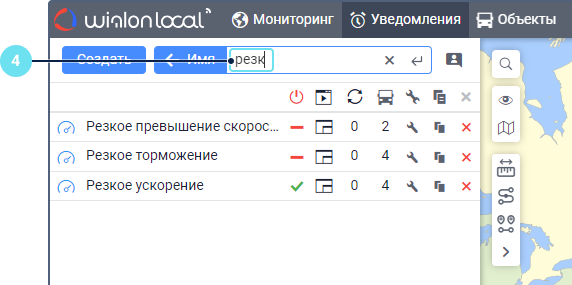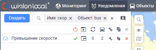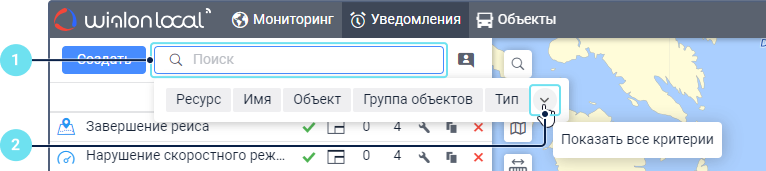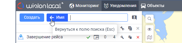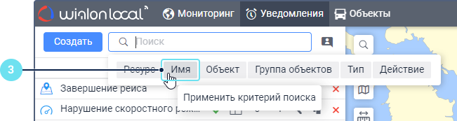 Под полем показываются все критерии поиска, которым соответствует ваш запрос. Например, если вы ввели скор и у вас есть уведомления с именем Превышение скорости, уведомления с типом Скорость и уведомления, созданные для группы объектов Скоростные автомобили, то под вашим запросом покажутся критерии Имя, Тип уведомления, Группа объектов.