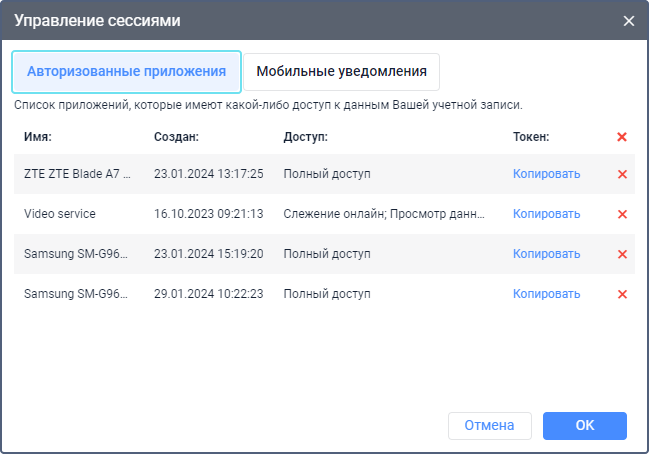 В окне Управление сессиями показывается список приложений, которые имеют доступ к вашей учетной записи, а также список устройств, которые могут принимать мобильные уведомления из Wialon. Эти списки формируются автоматически после входа в приложение.