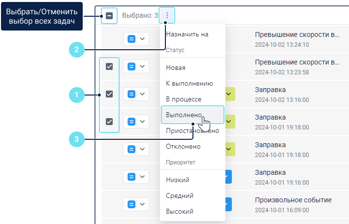 После регистрации события задача появляется в списке задач со статусом Новая. Вы можете изменить статус одной задачи или нескольких задач сразу.