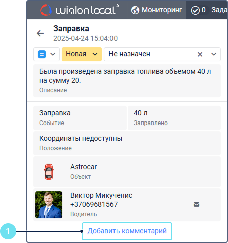 В этом блоке показывается иконка, имя и телефонный номер водителя, назначенного на объект во время события. Здесь также доступна иконка , которая позволяет открыть инструмент SMS. С помощью него вы можете отправлять SMS-сообщения на телефонный номер, указанный в свойствах водителя. Иконка неактивна, если не соблюдены требования для отправки SMS из системы мониторинга или в свойствах водителя не указан телефонный номер. Вы также можете открыть свойства водителя или историю его назначений. Для этого щелкните по иконке и выберите необходимый пункт. |