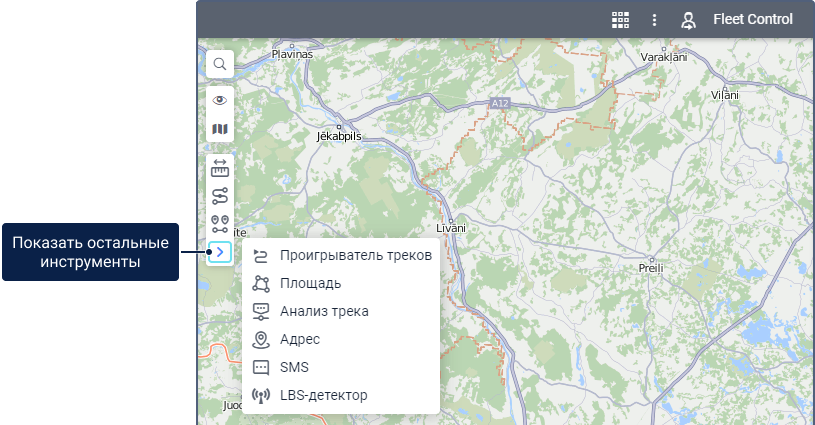 Меню с инструментами находится в левой части карты. По умолчанию показываются только иконки первых трех инструментов. Чтобы увидеть остальные, нажмите на иконку