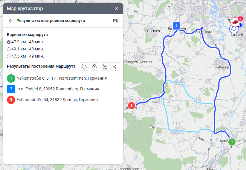 Если включена опция Альтернативные маршруты (доступна только при выборе источников маршрутизации Google, HERE, Sygic), то в разделе Варианты маршрута могут показываться несколько доступных вариантов с разным расстоянием и временем. Подходящий вариант можно выбрать как в самом разделе, так и на карте. На карте выбранный маршрут выделяется темно-синим цветом, а доступные альтернативные варианты — голубым.