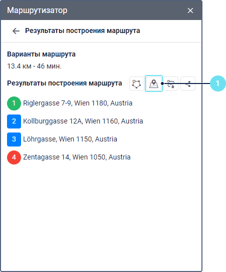 После этого на карте показывается маршрут, построенный в соответствии с добавленными точками и указанными настройками. Чтобы изменить точки или настройки и построить маршрут заново, нажмите на иконку