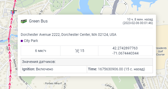 При наведении курсора на трек ближайшая точка в радиусе 50 пикселей, из которой было получено сообщение, подсвечивается пульсирующей окружностью. Во всплывающей подсказке к точке может показываться следующая информация: