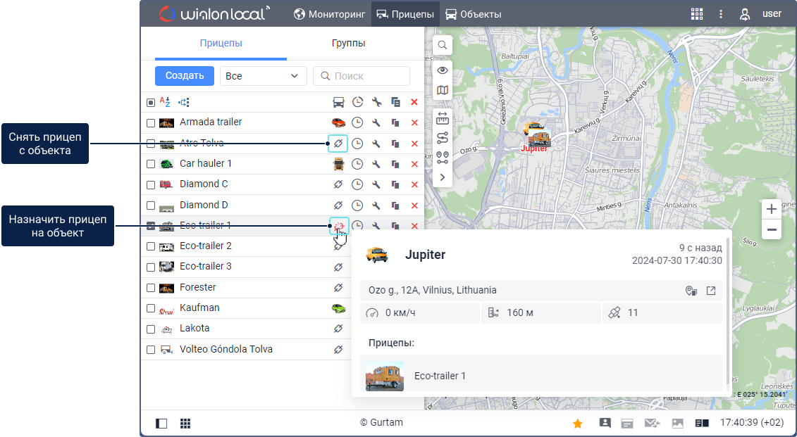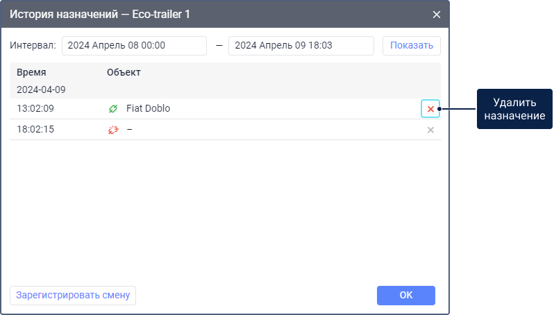 Назначить и снять прицеп с объекта можно вручную или автоматически. После этого можно работать с историей назначений.