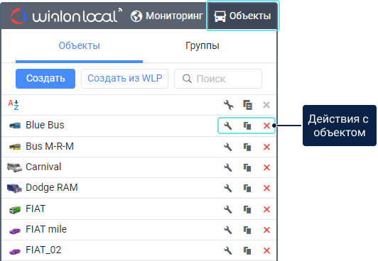 При помощи иконок, которые находятся в списке напротив имени объекта, можно выполнить перечисленные ниже действия.