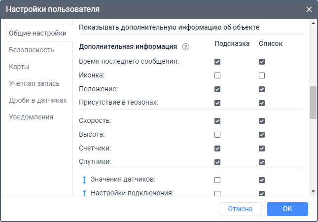 В этом разделе можно настроить дополнительную информацию об объекте. Пункты, отмеченные в столбце Подсказка определяют содержимое всплывающей подсказки к объекту, а отмеченные в столбце Список — содержимое расширенной информации об объекте в рабочем списке.