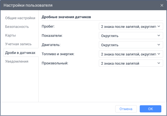 На этой вкладке настроек пользователя можно выбрать, как дробные значения датчиков должны показываться в сообщениях, отчетах, всплывающих подсказках и других местах интерфейса.