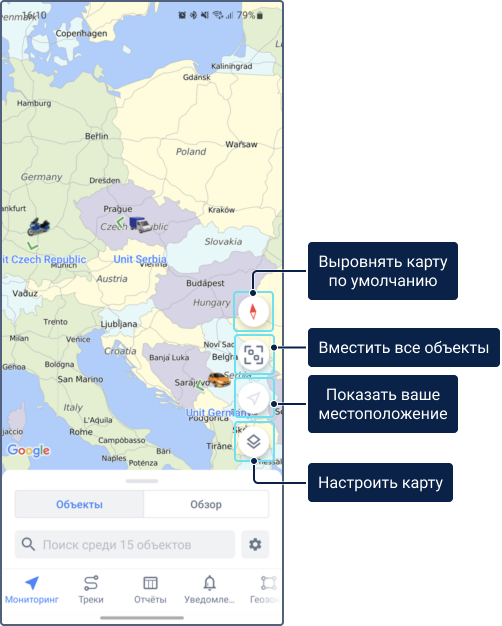 По умолчанию карта центрируется таким образом, чтобы все объекты показывались на экране. Чтобы вручную центрировать карту на всех объектах, нажмите на иконку