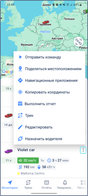 Из меню объекта вы можете выполнять такие действия, как отправка команд, создание отчетов, отправка местоположения, изменение имени и иконки объекта, назначение водителей и другое.