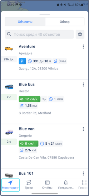 В режиме просмотра объектов показываются карточки отдельных объектов. Они содержат последние известные данные объекта и меню управления объектом, позволяющее отправлять команды, делиться местоположением, строить отчеты и треки и выполнять другие действия.