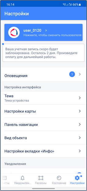 На вкладке Настройки можно ознакомиться с оповещениями, изменить параметры интерфейса, карты, уведомлений, сменить пользователя или выйти из приложения, ознакомиться со списком возможных проблем и их решением, а также открыть документацию к приложению.