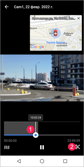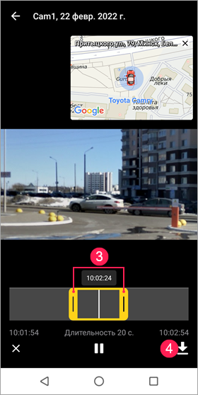 С помощью ползунков слева и справа установите продолжительность до и после события в секундах. Минимальная допустимая продолжительность — 2 секунды, максимальная — 60 секунд. Продолжительность сохраняемого фрагмента равняется сумме секунд до и после события (положения белого ползунка) и показывается под временнóй шкалой.