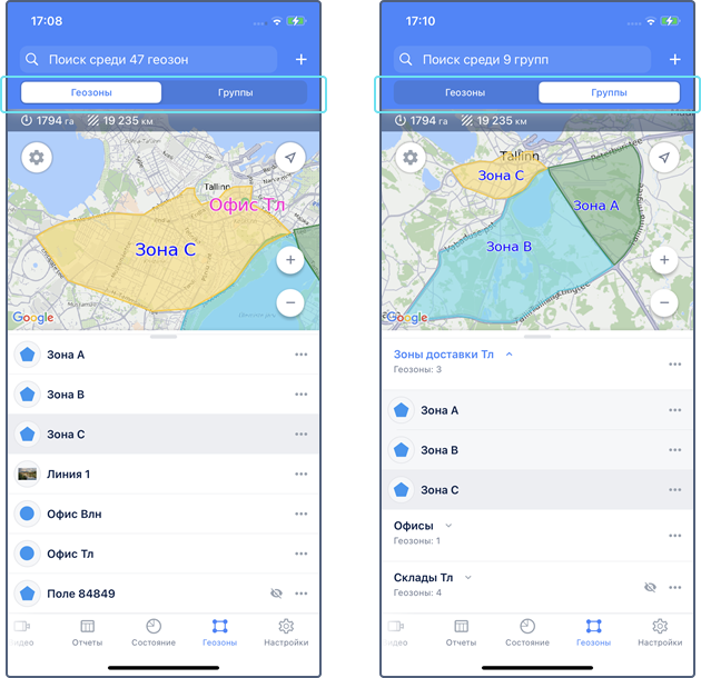 В левом верхнем углу карты можно увидеть площадь и периметр выбранной в списке геозоны. Чтобы развернуть блок со списком на весь экран, потяните его за верхнюю границу.