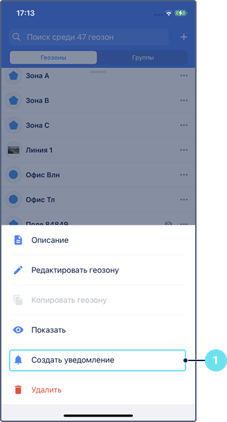 или долгого нажатия на геозону в списке открывается меню, в котором в зависимости от прав доступа и формы геозоны могут содержаться следующие действия: