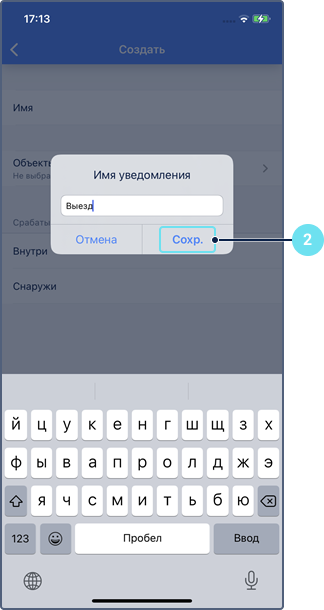 Создать уведомление | Создание шаблона уведомления типа Геозона. См. подробнее ниже. |