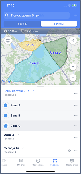 В режиме Группы показываются имена групп и число входящих в них геозон. Чтобы открыть список геозон, входящих в группу, нажмите на строку с ней.