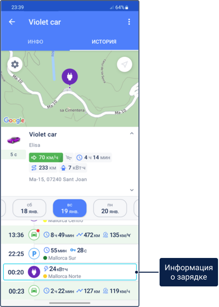 Чтобы просмотреть информацию о зарядке, нажмите на маркер зарядки на временнóй шкале или на карте. Эта информация содержит: