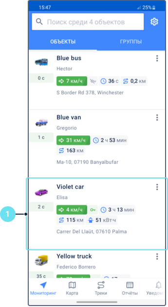 Карточки объектов содержат последние данные об объекте, его датчиках, параметрах и др. Вы можете видеть их в списке объектов и в информации об объекте на вкладке Мониторинг. Карточки объектов настраиваются.