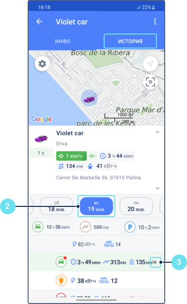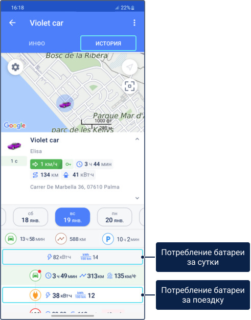 В истории объекта вы можете увидеть данные об общем и среднем потреблении батареи за день и за поездку. Чтобы их найти, сделайте следующее:
