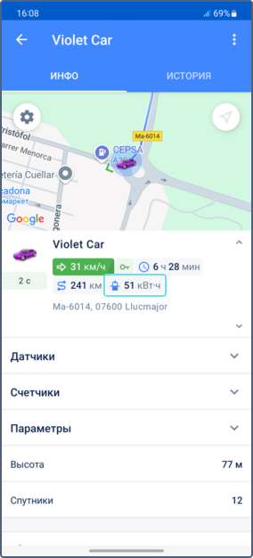 Результат: Уровень заряда батареи в кВт·ч показывается в карточках всех объектов с датчиками уровня заряда батареи. Если у объекта несколько датчиков со включенной опцией Рассчитывать данные по датчику, их значения суммируются.