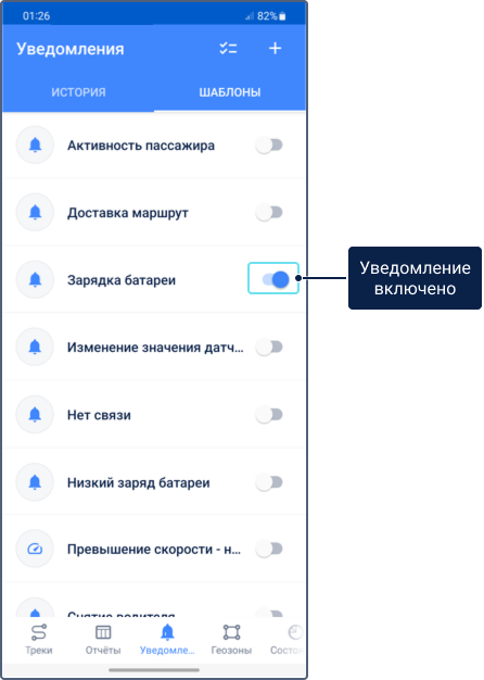 Чтобы видеть сработавшие уведомления в мобильном приложении, проверьте, включено ли уведомление в списке шаблонов на вкладке Уведомления.