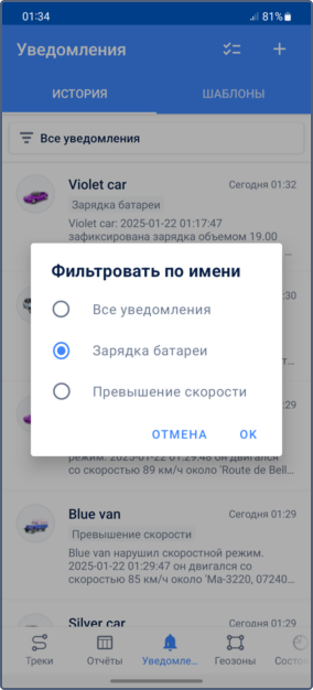 После срабатывания уведомления о зарядке вы можете найти его на вкладке История. Уведомления можно фильтровать по их названию.