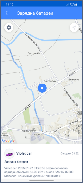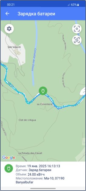 . Нажмите на эту строку, чтобы увидеть на карте, где заряжался объект.